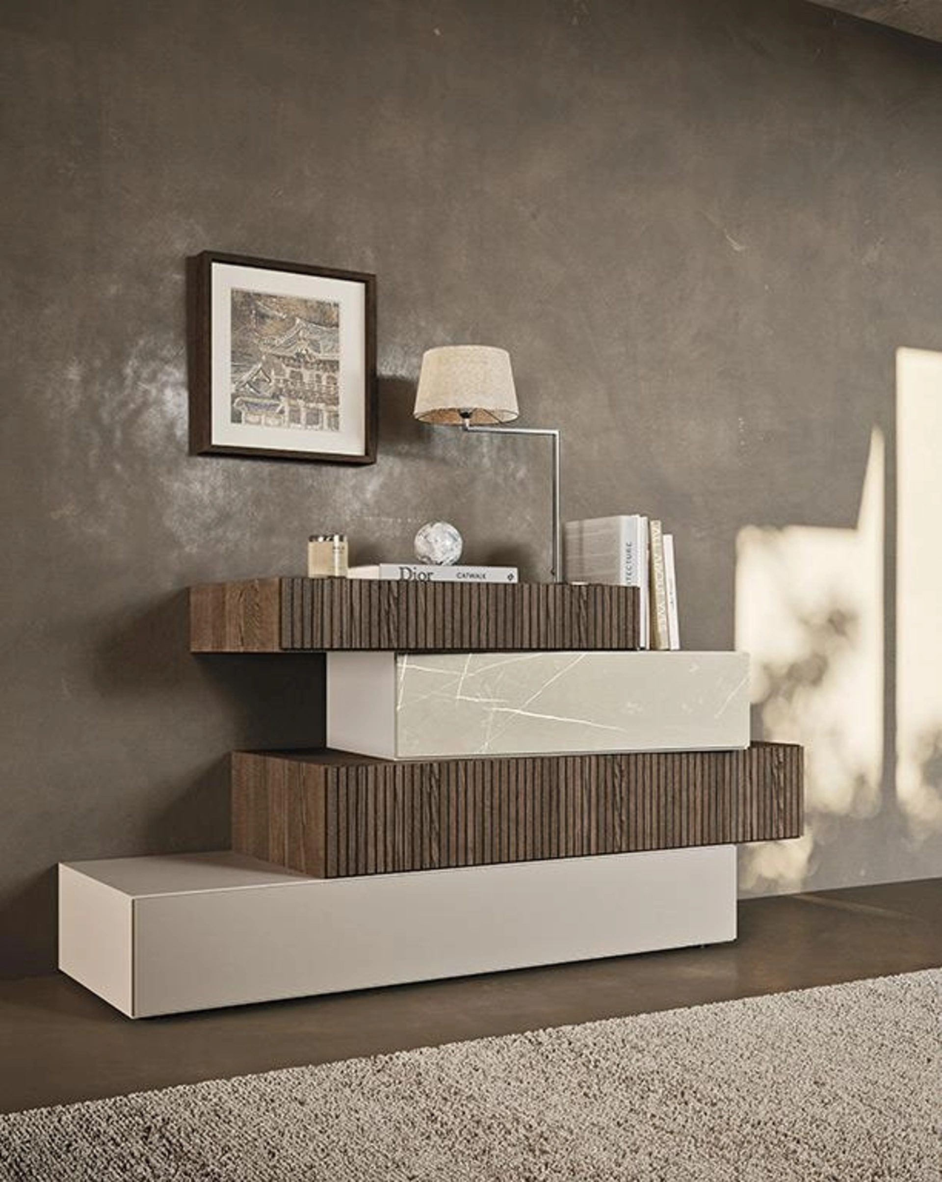 I Comodini, comò e gruppi notte possono essere coordinati al letto e al guardaroba oppure possono essere in voluto contrasto con essi: la scelta si baserà sulle vere disponibilità di spazio e sulla ricerca di un equilibrato effeto finale. Il Comò Quadra di Mobilgam è una tra le più originali soluzioni capaci di regalare un tocco di stile in aggiunta alla camera, con l'uso di finiture di pregio. Da noi ti attende un ricco catalogo di mobili e complementi design del noto e conosciuto marchio, leader nella produzione di Arredamento Casa per la camera da letto.