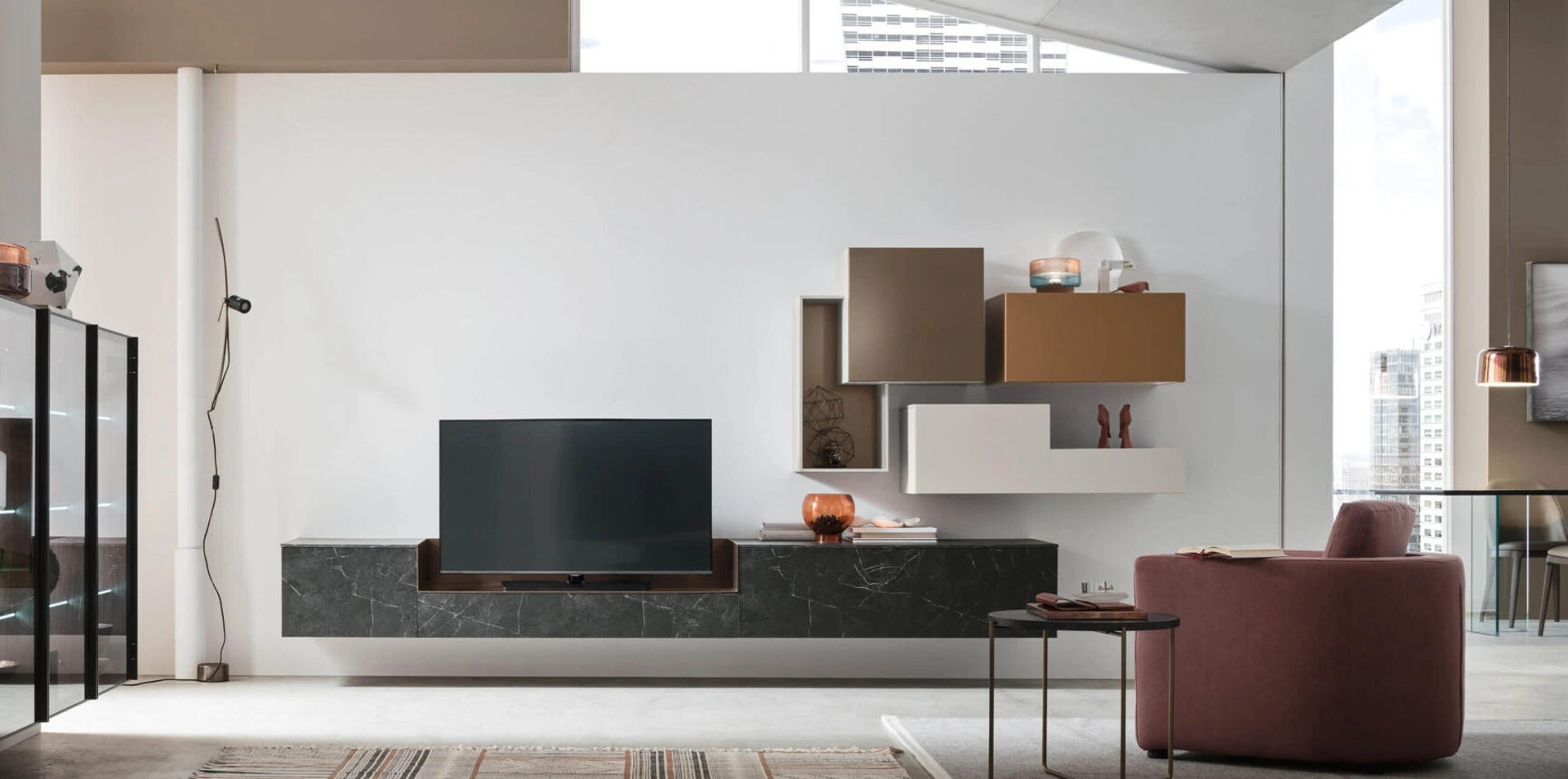 Le Pareti Attrezzate hanno acquisito un posto importante nella zona giorno delle nostre case: sono mobili plurifunzionali e salvaspazio sempre realizzabili su misura per te. Attraverso un gioco dinamico di accostamenti fra accessori a giorno o vani chiusi, le Pareti Attrezzate moderne arredano il living usufruendo al meglio di ogni spazio. Questa parete attrezzata è una delle soluzioni della firma e ti permetterà di progettare il living secondo le più personali esigenze abitative.